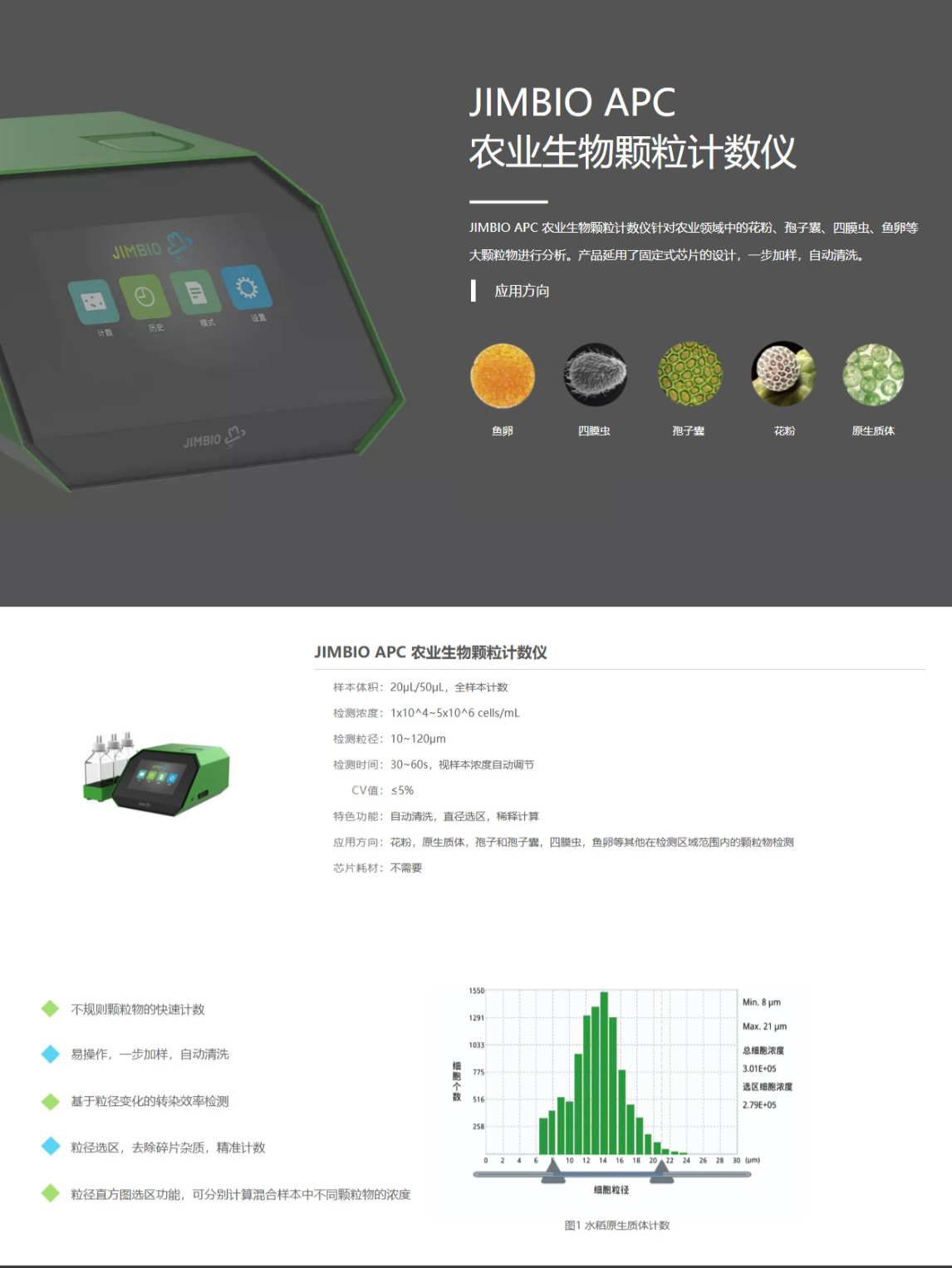 JIMBIO APC 农业生物颗粒计数仪针对农业领域中的花粉、孢子囊、四膜虫、鱼卵等大颗粒物进行分析。产品延用了固定式芯片的设计,一步加样,自动清洗。