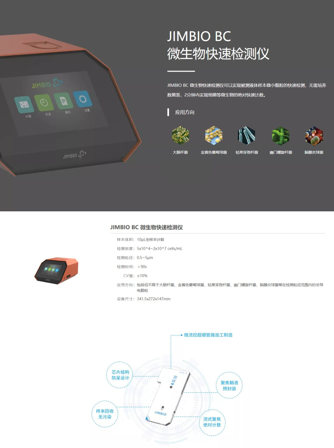 JIMBIO BC微生物快速检测仪可以实现被测液体样本微小颗粒的快速检测,无需培养数菌落,2分钟内实现细菌等微生物的绝对快速计数。