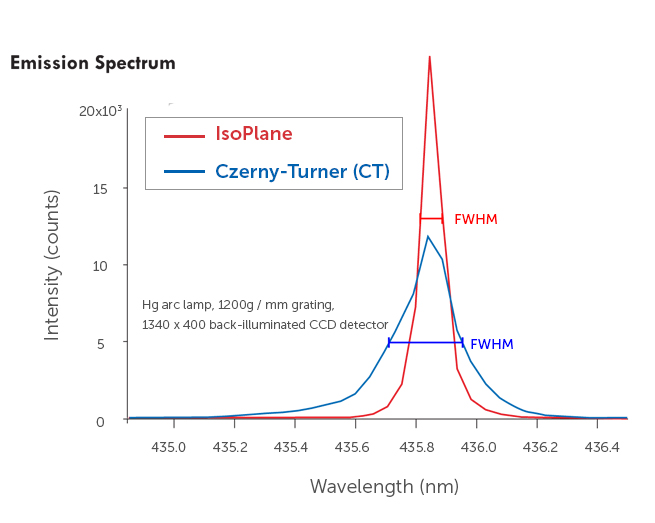 由于每个像素有更多的光子,IsoPlane增加了光谱分辨率和对比度。传统的Czerny-Turner摄谱仪只能测量宽的、变形的和短的发射线。然而,IsoPlane测量的是宽度减半、高度翻倍的发射线,提供分辨率更高的光谱,最大限度地提高了灵敏度和信噪比。